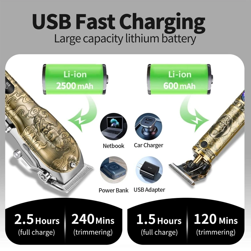 3.Retro anti-slip metal texture carving design and body one-touch button design for easy hold and control,makes you enjoy hair cutting. LED display reminds you to charge in time.